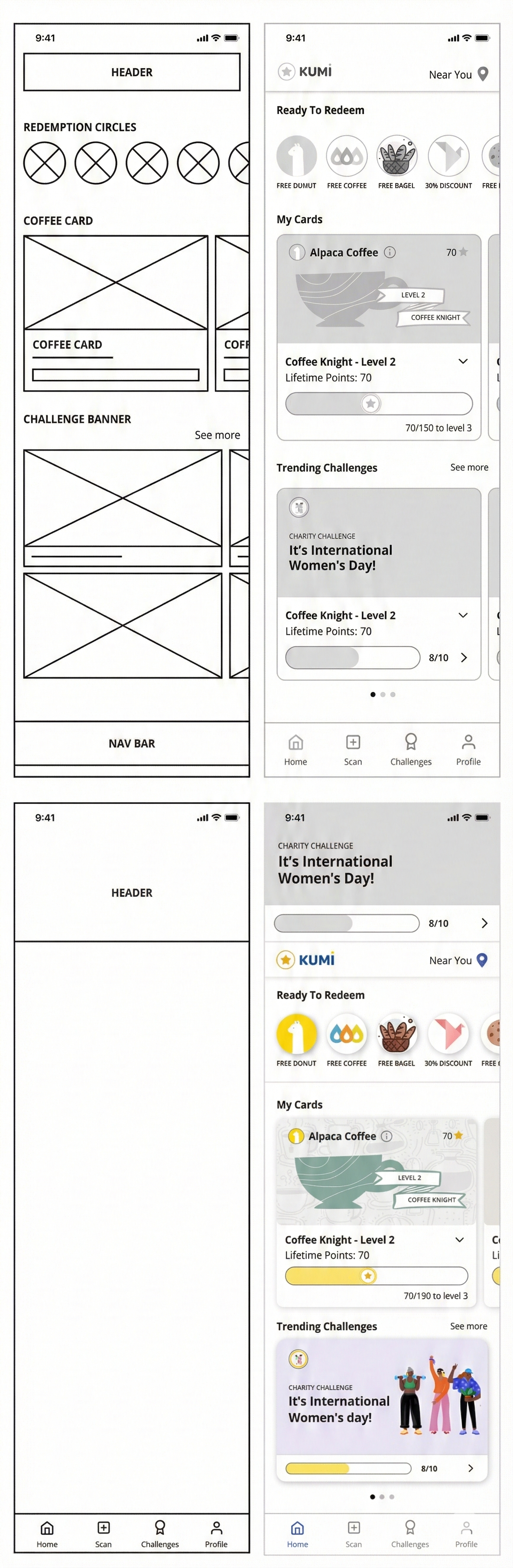 This phase of the design process also called for many refinements and finishing touches for our prototyping. We focused on adding personality, feedback and interactivity by mapping out transitions, special interactions and animations. Our group dedicated ourselves to learning more complex Figma prototyping skills so that we were able to create expanding cards, interactive buttons and scrollable carousels to give our app a true high fidelity feel.